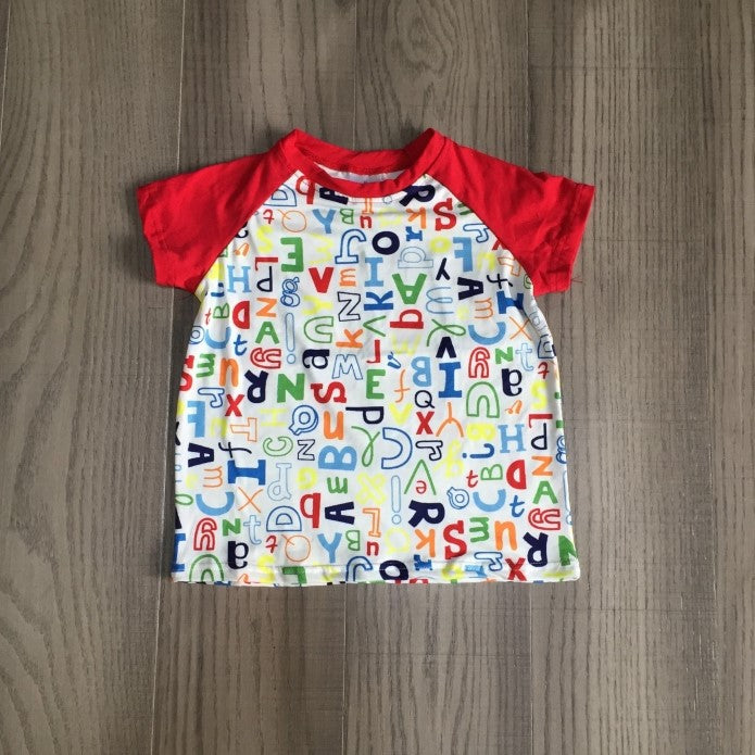 Show some red, white and blue and green   letters  This top is a classic crew neck cut keeping him cool and comfortable . This shirt features red sleeves and neck  So perfect for all  events.
